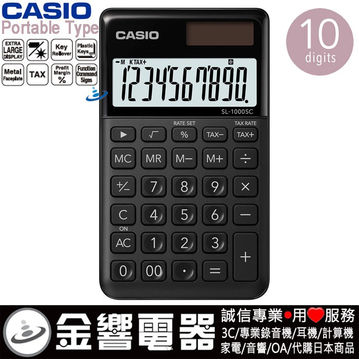 CASIO SL-1000SC-BK(公司貨,保固2年):::香檳計算機,攜帶型,商用計算機,10位數,百分比計算,刷卡或3期,SL1000SC