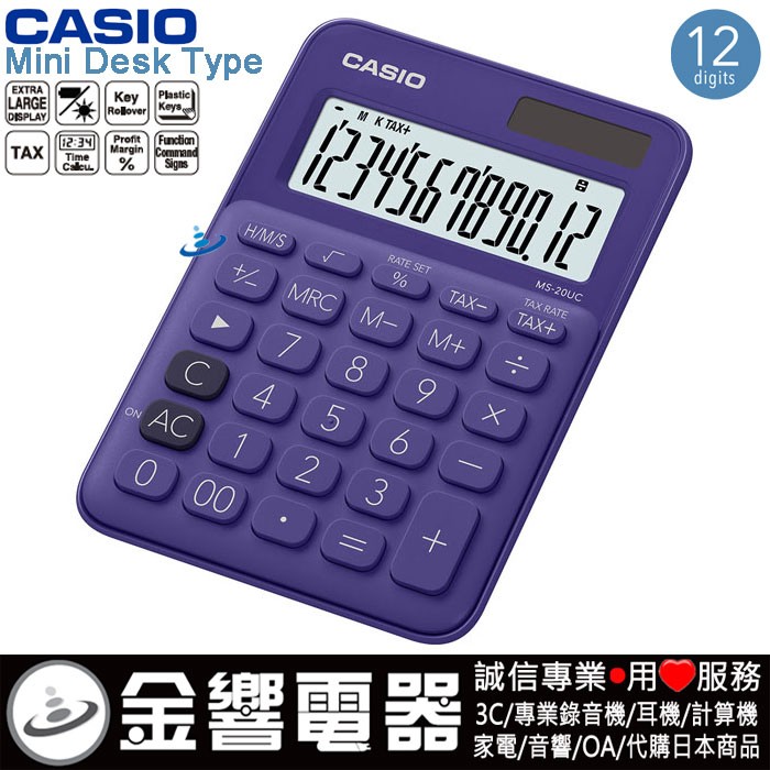 CASIO MS-20UC-PL(公司貨,保固2年):::馬卡龍計算機,小型桌上型,商用計算機,12位數,利潤率計算,刷卡或3期,MS20UC