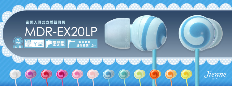 ●金響為台灣索尼正式授權經銷商,請安心購買SONY公司貨商品;金響提供您優惠的價格與網購紅利積點回饋。 MDR-EX20LP Jienne MINI 系列,糖果造型輕巧可愛,共12 種繽紛色彩 流行可愛。 自2009/7/1起,本耳機提供自購買日期起一年之免費保證服務(需憑「有效之保固卡」方可享有保固服務)。 ● ●繽紛色彩流行可愛,對應耳機本身的耳機線 ●彩色對應的舒適耳塞 ●12 種糖果般可口的螺旋配色 ●混合矽膠耳塞貼合更牢固,長時間聆聽也不會感到不適 ●9mm 驅動單體,呈現高解析度高音、中音以及超強重低音 ● ●愛心形狀設計的 Y 型導線滑動器,可防止耳機線纏繞糾結 ●鍍金 L 型立體聲迷你插頭 ●隨附 3 種尺寸(SS / S / M)耳塞,可以穩定舒適地貼合在耳內 [商/品/規/格] ●型號:MDR-EX20LP ●型式:封閉式、動態 ●喇叭:9mm、圓頂型 ●最大承受功率:100 mW ●阻抗:16 Ω(1kHz) ●音壓感度:100dB/mW ●頻率響應:8~22,000Hz ●引線:1.2m、絞合線 Y 型 ●入力插頭:長線(鍍金L型立體聲插頭) ●重量:3g(不含線) ●附件:砲彈型交換用耳塞(SS/S/M)各2個、說明書、台灣索尼公司貨保證書。