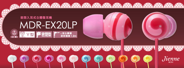 ●金響為台灣索尼正式授權經銷商,請安心購買SONY公司貨商品;金響提供您優惠的價格與網購紅利積點回饋。 MDR-EX20LP Jienne MINI 系列,糖果造型輕巧可愛,共12 種繽紛色彩 流行可愛。 自2009/7/1起,本耳機提供自購買日期起一年之免費保證服務(需憑「有效之保固卡」方可享有保固服務)。 ● ●繽紛色彩流行可愛,對應耳機本身的耳機線 ●彩色對應的舒適耳塞 ●12 種糖果般可口的螺旋配色 ●混合矽膠耳塞貼合更牢固,長時間聆聽也不會感到不適 ●9mm 驅動單體,呈現高解析度高音、中音以及超強重低音 ● ●愛心形狀設計的 Y 型導線滑動器,可防止耳機線纏繞糾結 ●鍍金 L 型立體聲迷你插頭 ●隨附 3 種尺寸(SS / S / M)耳塞,可以穩定舒適地貼合在耳內 [商/品/規/格] ●型號:MDR-EX20LP ●型式:封閉式、動態 ●喇叭:9mm、圓頂型 ●最大承受功率:100 mW ●阻抗:16 Ω(1kHz) ●音壓感度:100dB/mW ●頻率響應:8~22,000Hz ●引線:1.2m、絞合線 Y 型 ●入力插頭:長線(鍍金L型立體聲插頭) ●重量:3g(不含線) ●附件:砲彈型交換用耳塞(SS/S/M)各2個、說明書、台灣索尼公司貨保證書。