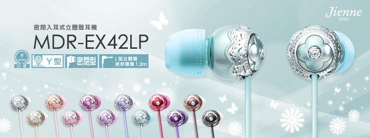 ●金響為台灣索尼正式授權經銷商,請安心購買SONY公司貨商品;金響提供您優惠的價格與網購紅利積點回饋。 Jienne CHIC 系列,採用 Swarovski 水晶 12 款花卉色彩,造型成熟神祕。9mm 驅動單體,呈現高解析度高音、中音以及超強重低音。隨附 SS 尺寸的耳塞,適合較小耳型使用。 自2009/7/1起,本耳機提供自購買日期起一年之免費保證服務(需憑「有效之保固卡」方可享有保固服務)。 ● ●採用 SWAROVSKI ZIRCONIA ( 施華洛士奇水晶切割造型 ) 鑄造點綴的花心設計,呈現花朵般美麗的光澤 ●侈奢繽紛的耳機線 ●彩色對應的舒適耳塞 ●12種甜蜜而浪漫的花卉圖案,成熟神祕多彩流線型設計 ● ●有角度的耳塞結構使佩戴穩定而舒適 ●混合矽膠耳塞貼合更牢固,長時間聆聽也不會感到不適 ●9mm 驅動單體,呈現高解析度高音、中音以及超強重低音 ● ●蝴蝶造型設計的 Y 型導線滑動器,可防止耳機線纏繞糾結 ●鍍金 L 型立體聲迷你插頭 ●隨附 3 種尺寸(SS / S / M)耳塞,可以穩定舒適地貼合在耳內 [商/品/規/格] ●型號:MDR-EX42LP ●型式:封閉式、動態 ●喇叭:9mm、圓頂型 ●最大承受功率:100 mW ●阻抗:16 Ω(1kHz) ●音壓感度:100dB/mW ●頻率響應:6~23,000Hz ●引線:1.2m、絞合線 Y 型 ●入力插頭:長線(鍍金L型立體聲插頭) ●重量:3g(不含線) ●附件:砲彈型交換用耳塞(SS/S/M)各2個、說明書、台灣索尼公司貨保證書。
