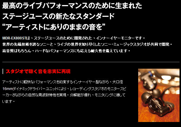 日本國內販賣機種,如蒙訂購請先支付訂金NT$2,000,或一次付清全額貨款,約5~14天交貨。 日本國內款(日本樂器店限定款) 保固一年 MDR-EX800ST,專為了舞台音樂工作者開發,專業監聽耳機。世界的先端技術而自豪的索尼、現場音樂工作室的SONY MUSIC共同開發。高音質,具備硬件性能的耐久性。