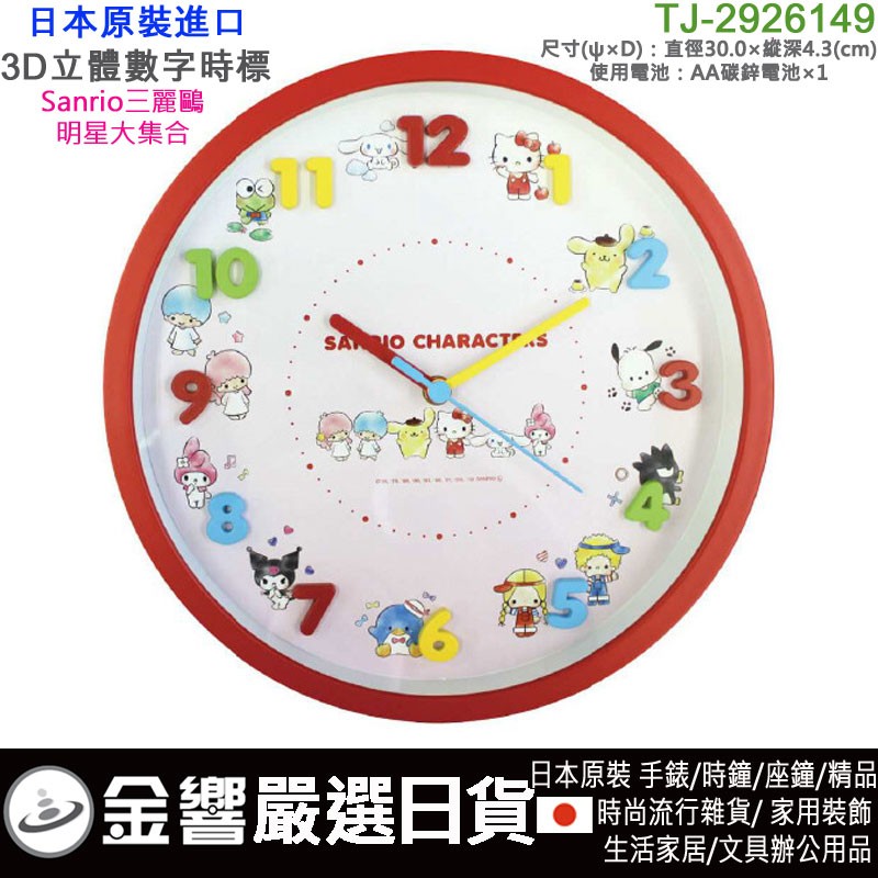 【金響日貨】Sanrio三麗鷗 TJ-2926149(日本國內款):::時尚掛鐘,連續秒針,靜音,3D立體數字時標,直徑30cm,刷卡或3期,4518648282369