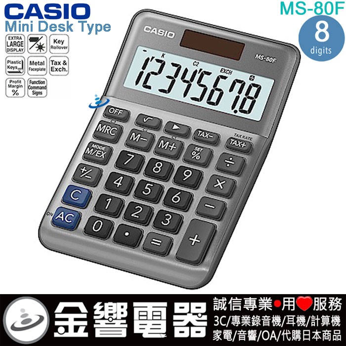 ●金響電器,現貨,CASIO MS-80F(公司貨,保固2年):::小型桌上型,商用計算機,8位數,金屬面板,大型顯示幕,MS80F,取代MS80B