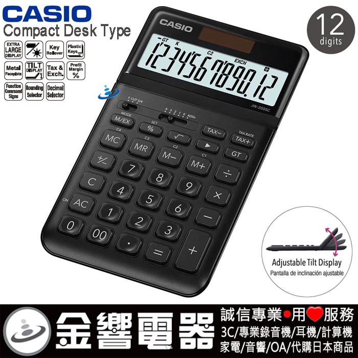 CASIO JW-200SC-BK(公司貨,保固2年):::香檳計算機,中型桌上型,商用計算機,12位數,可掀式面板,刷卡或3期,JW200SC