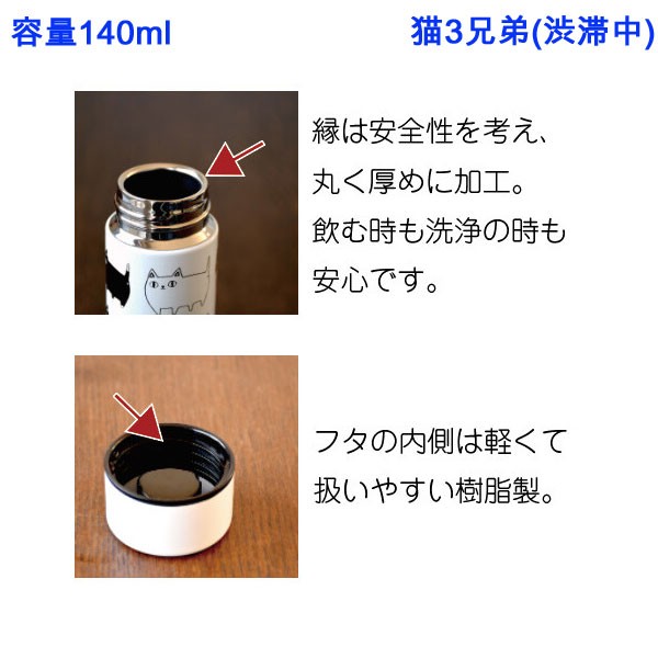 不鏽鋼保溫保冷瓶已經出現在流行的貓三兄弟系列圖案!非常緊湊,容量為140ml。 適合小袋和口袋。 這是一個適合小郊遊的尺寸大小。方便外出攜帶。
