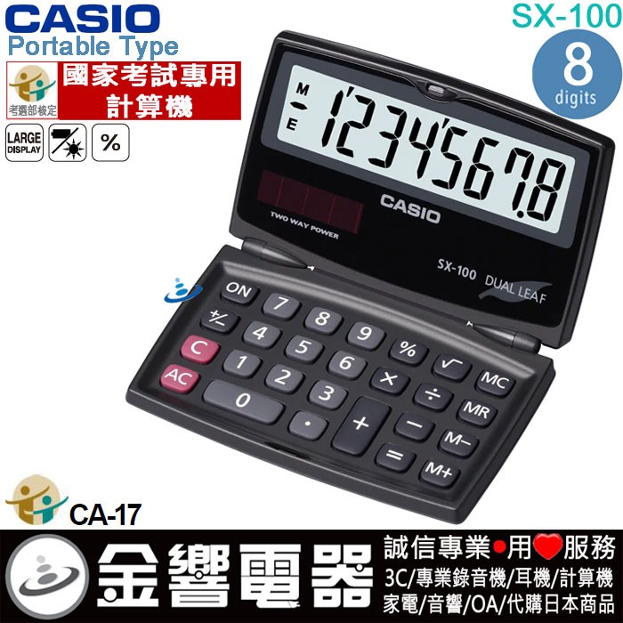 ●金響電器,現貨,CASIO SX-100(公司貨,保固2年):::小型摺疊式攜帶型商用計算機,8位數,國家考試專用計算機,SX100