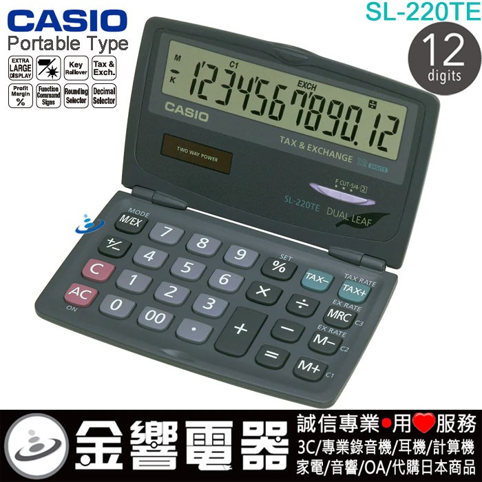 dot ●金響電器,現貨,CASIO SL-220TE(公司貨,保固2年):::摺疊式攜帶型商用計算機,12位數,SL220TE