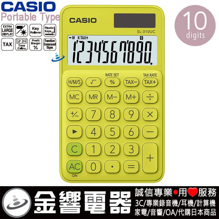 dot 金響電器‧金響日貨:::歡迎蒞臨金響門市參觀選購 EST.1995 » 學習用品 » 計算機館 » 商務計算機 » 馬卡龍計算機 » SL-310UC » CASIO SL-310UC-YG(公司貨,保固2年):::馬卡龍計算機,攜帶型,商用計算機,10位數,利潤率計算,刷卡或3期,SL310UC