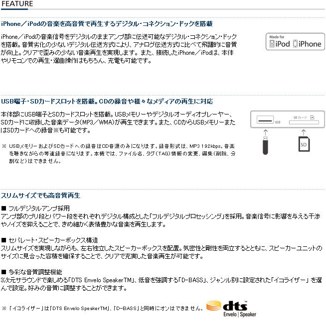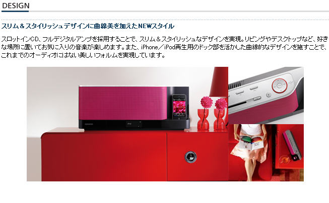 ※注意:此款iPod/iPhone Personal System,FM收音機,台灣不適用。 吸入式CD、全數位放大器採用、實現薄形&有風格的設計。客廳和桌面、放置在喜歡的地方喜愛的音樂能享樂。還有iPhone/iPod播放用的基座部的曲線的設計,實現著到目前音頻系統沒有的美麗的外觀。 [商/品/規/格]