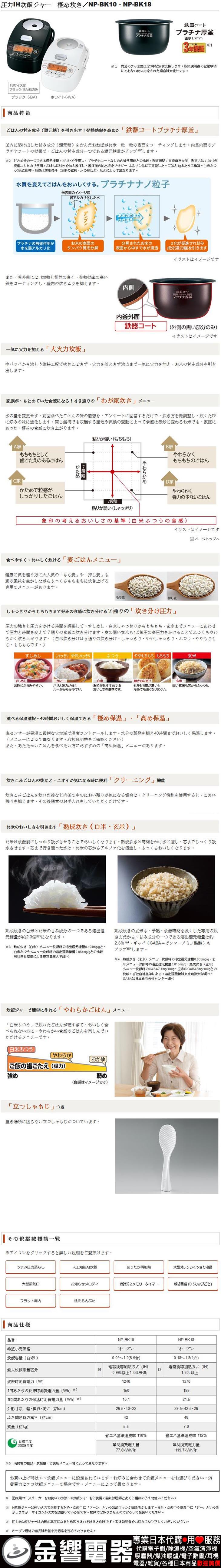 dot 金響電器‧金響日貨:::歡迎蒞臨金響門市參觀選購 EST.1995 » 其他雜項 » 已完售商品 » 已完售,ZOJIRUSHI NP-BK10-BA(日本國內款):::2020年最新,日本製,象印壓力IH電子鍋,5.5合炊き,6人份,極め炊き,鉄器コート,プラチナ厚釜