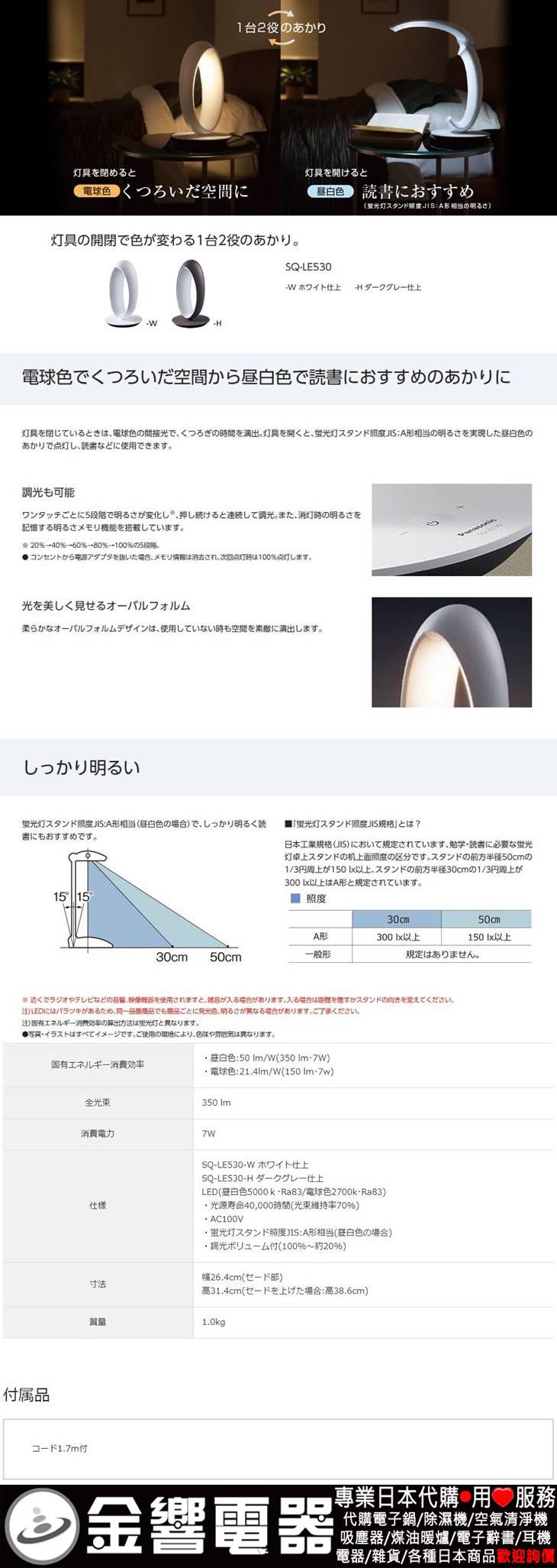dot 代購,Panasonic SQ-LE530-H(日本國內款):::國際牌LED檯燈,可調光,免運費,刷卡或3期零利率,SQLE530