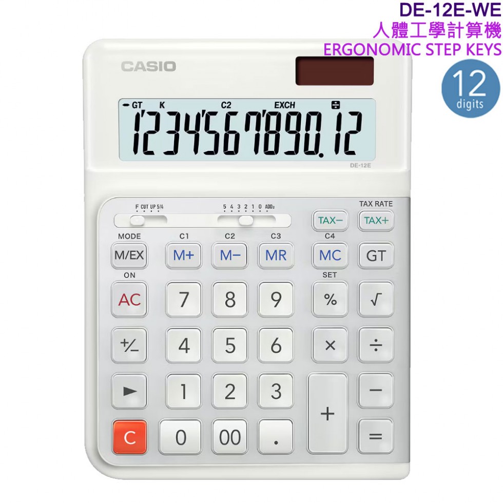 ●金響電器,現貨,CASIO DE-12E-WE白色(公司貨,保固2年):::桌上型商用計算機,12位數,人體工學計算機